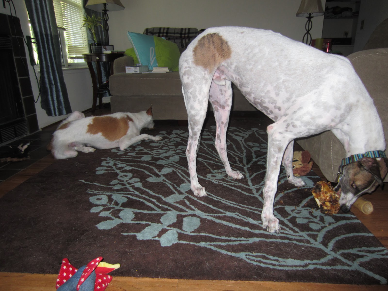 But, I endured it. Its payed off! FM gibs us a mussage wifs a towel outside den we came inside and watched FM wiggle in da floor (she says dis was her workin' out, but I sayz she needs to practice her zoomies...). After she was done wifs her wiggles, she surprised de Old Man and mes and gibs us de noms!!! I LUB DE NOMS!!!!!!!